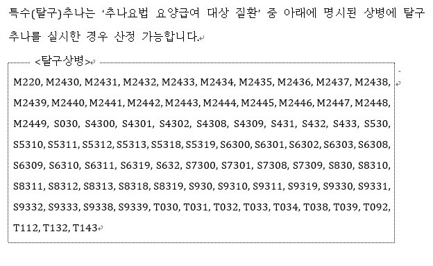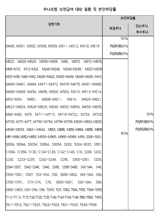 추나요법 자료 제출 시 급여 대상 상병이 주상병으로 기제해야 합니다. * 3단 또는 4단 상병은 그 이하 상병 포함 (예) M12는 M1200~M1289까지 포함, M023은 M0231~M0239까지 포함