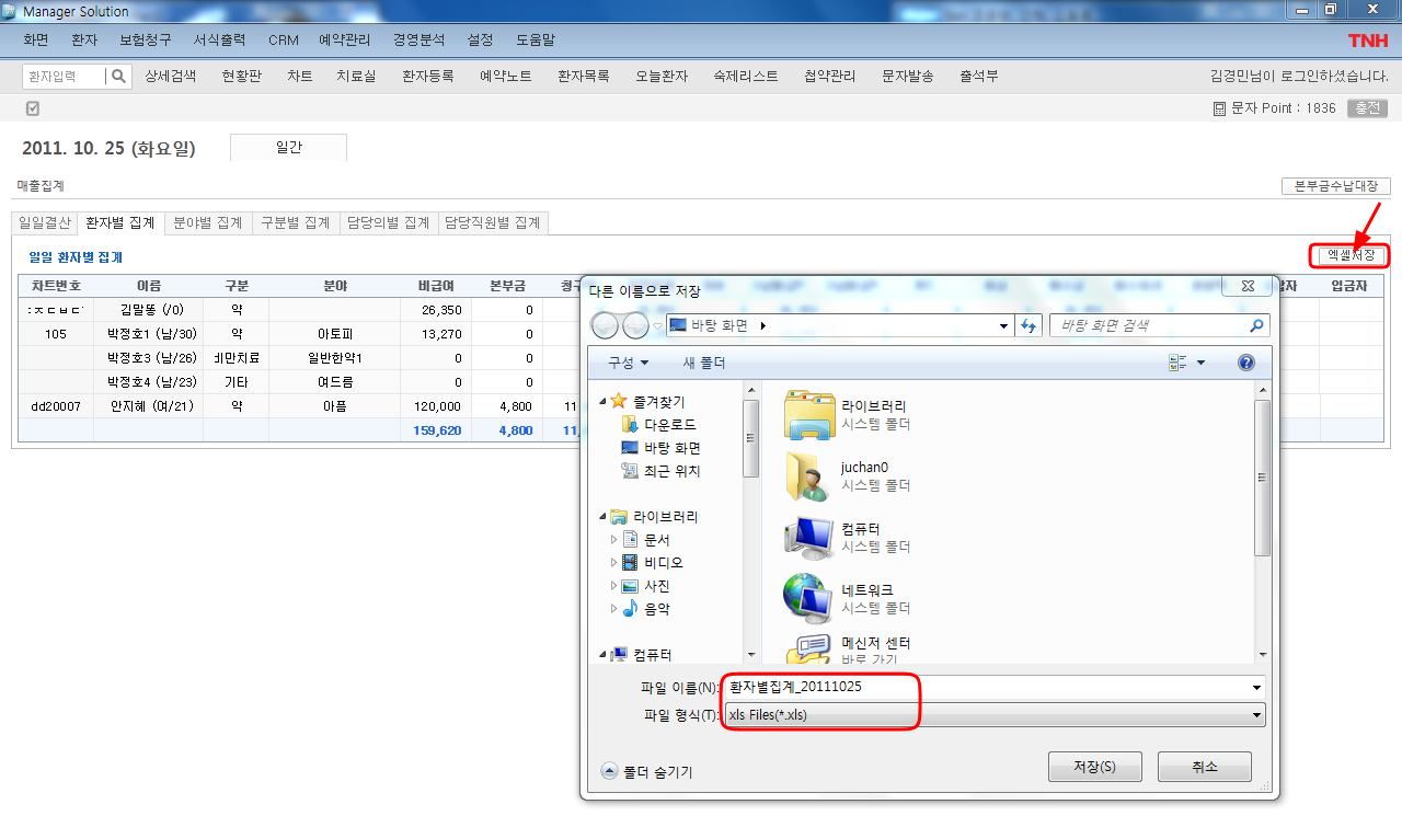13) 경영분석에서 환자별집계를 엑셀 또는 텍스트 파일의 형태로 저장할 수 있는 기능을 추가하였습니다.