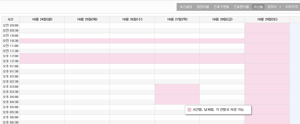 - 가로 축 상단(일, 담당의, 분야, 구분 등)을 선택하면 세로 영역을 모두 선택 할 수 있습니다.