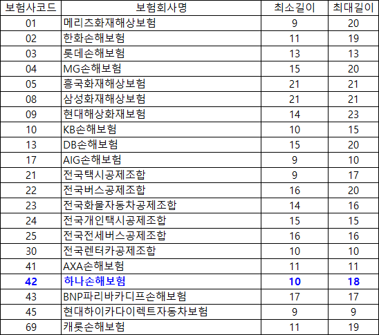 1. 자동차보험 회사 정보 중 '하나손해보험' 사고접수번호의 길이가 기존 '18자리'에서 '10~18자리'로 변경되어 프로그램 수정 (2022.2.21. 기준)