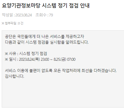 [건강보험공단] 요양기관정보마당 시스템 정기 점검 안내